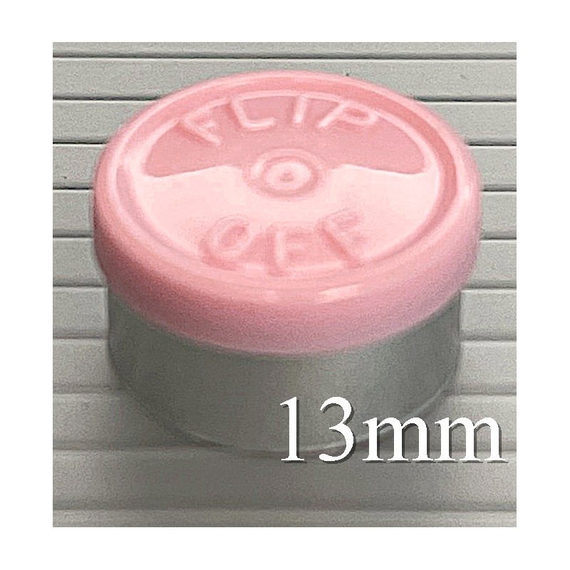 13mm Flip Off Vial Seals, Gloss Pink, Pack of 100. For serum vials with a 13mm outer rim diameter and 7mm hole opening. Manufactured in the USA by West Pharmaceutical Services.